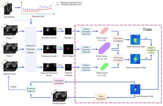 In the proposed framework, the ground truth is first used to extract two spectral curves, namely the maximum spectral curve (MASC) and the minimum spectral curve (MISC). Both of these two curves are used to judge the possible range of the target spectral curve, considering the influence of the light. Then, the dimensionality of the original HSIs is reduced by computing the deviation between the target spectral curve and the spectral range from MISC to MASC. Subsequently, the D-Siam framework is employed to simultaneously compute the similarities of the search region with template 1 and the adjacent template. These two results, namely the initial response map and the adjacent response map, are obtained through feature extraction network and pixel-wise correlation. Further, an adaptive-weight-based fusion is utilized to fuse these two response maps to obtain the fused response map. Finally, the target scale is estimated by comparing several fused response maps generated by different scale search regions. In addition, confidence calculation module obtains the confidence of the predicted target, which is used to decide whether to update the adjacent template in the threshold judgment module. In Section 3.1, the proposed spectral deviation-based dimensionality reduction method is introduced in detail. The SiamFC framework, adopted as a base framework in this study, is briefly discussed in Section 3.2. In Section 3.3, the proposed D-Siam framework and the target prediction approach are discussed, including weighted fusion and scale estimation. Moreover, then, the threshold judgment method is discussed in Section 3.4. Finally, the pseudocode of the proposed algorithm is given in Section 3.5.