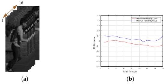 Recently, machine learning-based target tracking [,] has become an important frontier in the field of computer vision, with applications in different fields [,], such as autonomous driving, aerospace, robotic navigation, and sports broadcasting. Most of the target tracking algorithms use the characteristics of the target, in the initial frames of a sequence, to predict the position of the target in the subsequent frames. However, various factors, including illumination variance, environmental changes, occlusion, etc., may alter the appearance of the target between the subsequent frames, causing tracking failure. Hence, it is important to design an appropriate target tracking model to adapt to the complex and changing environments to achieve tracking robustness. Recently, the development of hyperspectral imaging equipment with a high frame rate has popularized the hyperspectral videos (HSVs) for effective target tracking. In comparison to the RGB images [], the hyperspectral images (HSIs) [,,] pose the spatial and spectral information to improve the descriptive dimension of the target. The similar colored targets and backgrounds, which are indistinguishable in the RGB images, can be distinguished in the HSIs. This is because the HSIs use the spectral reflectance of the targets and backgrounds over tens to thousands of wavebands.