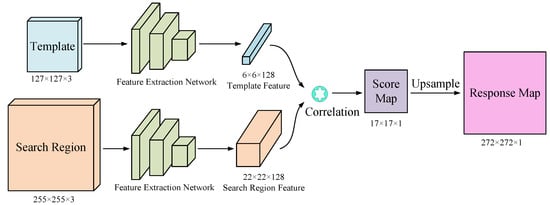 Fully convolutional Siamese network (SiamFC) consists of two sub-networks with the same structure. The inputs to the Siamese network, considered in this study, are two images, one is the template while the other is the search region. The template and the search region are selected from the first and the subsequent frames of the sequence, respectively. Each sub-network processes an image and uses the forward passes independently to generate the feature maps of the template and the search region. Subsequently, the cross-correlation computation is performed using the similarity measurement function on the two feature maps to yield a score map. Finally, the upsampling operation is performed on the score map to transform it to the response map. The point with the highest value in the response map is considered to be the center point of the object to be tracked in the subsequent frames. The overall framework of the SiamFC is shown in Figure 4. Although SiamFC has a significant improvement in real-time performance and accuracy, as Compared to the previous trackers, it is still limited in its ability to handle significant changes in the appearance of the target being tracked.