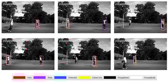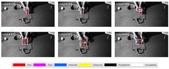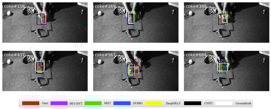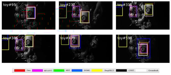Figure 11 shows the results of the proposed and the benchmark algorithms on the toy sequence. The main challenge of this sequence is IV. From frames 165 to 208, as the light is very low, only MHT and the proposed algorithm effectively track the target. The other four algorithms do not consider the relationship between the bands, and the low light condition makes it difficult to extract spatial features. Hence, at frame 237, when the light returns to normal, these four algorithms lose the target. At frame 479, MFI-HVT and DeepHKCF re-track the target as the target moves into their search regions.