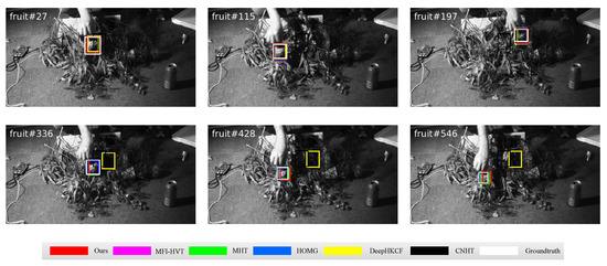 Figure 8 shows the results of the proposed and the benchmark approaches on the fruit sequence. The main tracking challenge of this sequence is BC. The tracking target is a hand-held fruit with many weeds around the fruit, resulting in significant background clutter interference. As the target suffers from serious background clutter interference, spatial features are unreliable. Among the benchmark algorithms, discussed in the current study, CNHT uses a predetermined target region as the convolution kernel, and DeepHKCF transforms the original HSIs into false-color images. Hence, these two methods only use spatial features and ignore spectral information. As a result, CNHT and DeepHKCF lose the tracking target early at frame 197 and frame 336, respectively. However, as the other algorithms use spectral features, they track the target well in this sequence.
