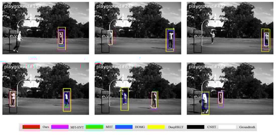 Figure 9 presents the results of the proposed and the benchmark approaches on the playground sequence. The main tracking challenge of this sequence is OCC. In this sequence, two men are running around the playground and they block each other circularly due to the placement of the camera. Among the approaches considered in this study, CNHT fails to track the target in almost the whole sequence as the initial size of the convolution kernel is too large to generate effective features. As is evident from the results, the black rectangle box is always located in the lower left of the image which is the initial location of the target. At frame 248, when the tracking target has been occluded by another man, only the proposed algorithm successfully tracks the target. The better performance of the proposed algorithm as compared to the state-of-the-art can be attributed to the usage of the update judgment. At frame 427, when the tracking target occludes the other man again, all of the other algorithms track the target again. However, with the continuous occurrence of occlusion, the updated models of these algorithms become indistinguishable. As a result, HOMG and DeepHKCF lose the target at frames 633 and 764 even if there is no occlusion.