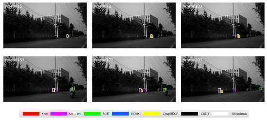 Figure 10 shows the results of the proposed and the benchmark algorithms on the rider sequence. The main challenge of this sequence is SV. The tracking target is a rider who rides the bike from far to near, resulting in the gradual enlargement of the target during the whole sequence. Among the various algorithms considered in this study, MHT loses the target at frame 157 when another rider enters the camera view. The sole dependence on the material features affects the performance of the MHT algorithm. Similarly, the MFI-HVT and DeepHKCF algorithms lose the targets at frames 172 and 207 as the large receptive fields of the deep features fail to represent the small targets. Although the proposed approach also uses deep features, the use of an adjacent template ensures the robustness of the tracking process.