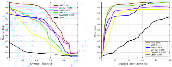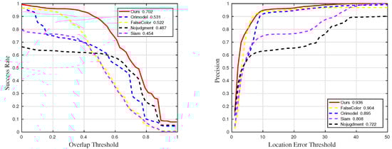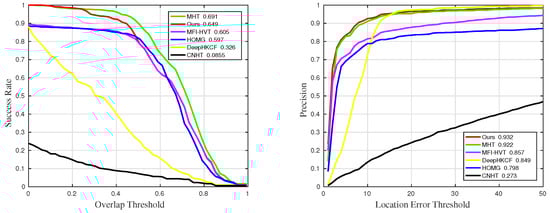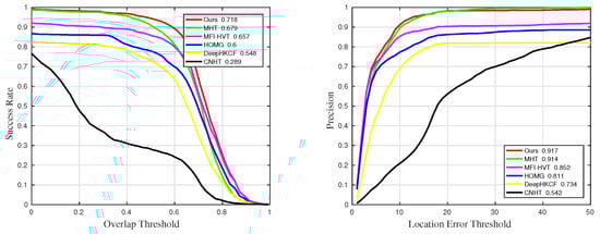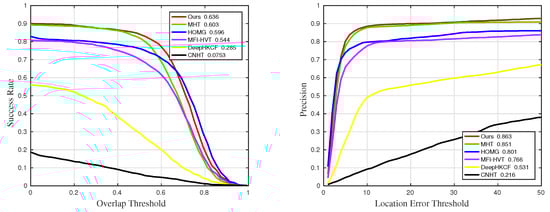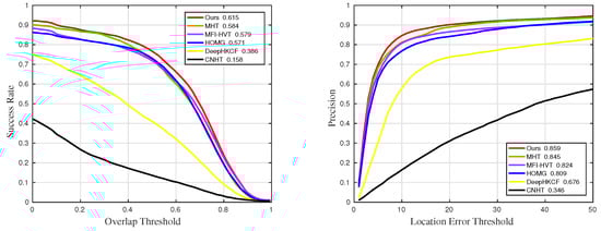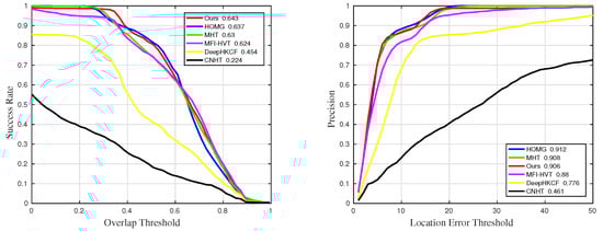 The proposed and the benchmark algorithms are quantitatively analyzed on the benchmark datasets using the success rate and precision curves. The success rate curve evaluates the overlap between the estimated target boxes and the ground truth. The X-axis of this curve is the threshold from 0 to 1, and the Y-axis is the percentage of the overlap above the threshold. The precision curve evaluates the distance between the center of the estimated target boxes and the ground truth. The X-axis of this curve is the threshold from 0 to 50, and the Y-axis is the percent of the distance below the threshold. Area under curve (AUC) is used to measure the performance of the tracking algorithms. As the ranges of the X-axis value of these two curves are different, to eliminate the influence of the value ranges, the average value of Y-axis is used to represent the AUC. Hence, the average Y-axis value can also be regarded as the score for evaluating performance. Figure 12 gives these two curves of all 35 sequences. Similarly, Figure 13, Figure 14, Figure 15, Figure 16 and Figure 17 illustrate the quantitative results on the partial sequences with different challenges such as BC, IV, OCC, RO, and SV. Among these figures, the performance scores are given in the legend following the tag of each of the algorithms. Furthermore, to compare the performance of the proposed and the benchmark algorithms more intuitively, the scores are listed in Table 1 and Table 2.