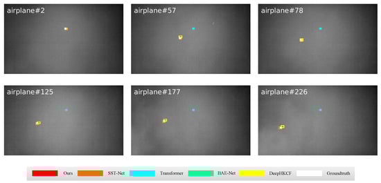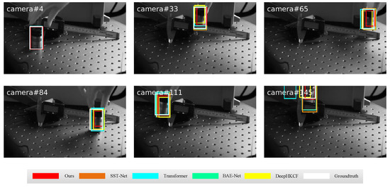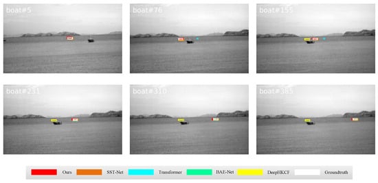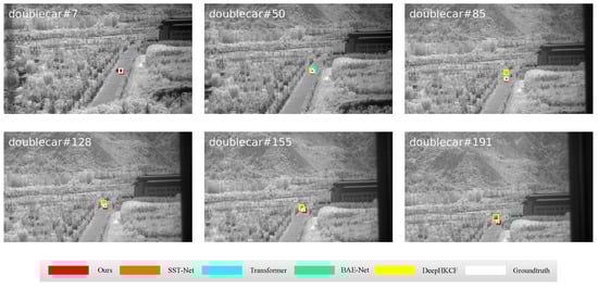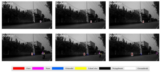 The qualitative performance of the proposed and the five benchmark approaches are analyzed in Figure 7, Figure 8, Figure 9, Figure 10 and Figure 11. The colored rectangular boxes, in the given Figures, correspond to the tracking of the benchmark algorithms used in the experiments. It should be noted that the white colored boxes represent the ground truth, which denotes the standard location of the target. Therefore, the closer the tracking bounding box of an algorithm is to the white rectangular box, the better the performance of the corresponding algorithm.
