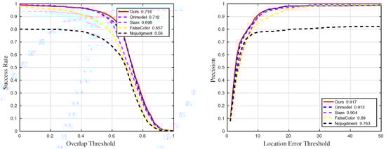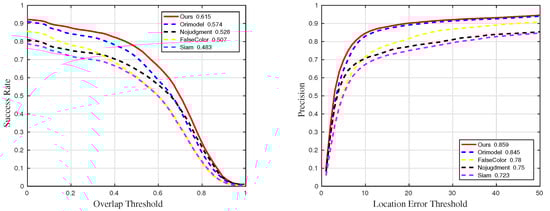 For the ablation experiments and comparative analyses, discussed in the current study, a publicly available benchmark hyperspectral video tracking dataset, IMEC16, is used. The details of the adopted dataset are discussed in [], and the dataset can be downloaded from www.hsitracking.com (The used dateset was accessed on 31 October 2020). The dataset comprises 35 groups of testing and 40 groups of training sequences. The training sequences are used to train the AlexNet model, and the testing sequences are used to verify the performances for both the comparative analyses and ablation experiments. It should be noted that the hyperparameters in the training process are the same as []. Both the testing and training groups contain hyperspectral and false-color sequences having pixel-to-pixel correspondence.