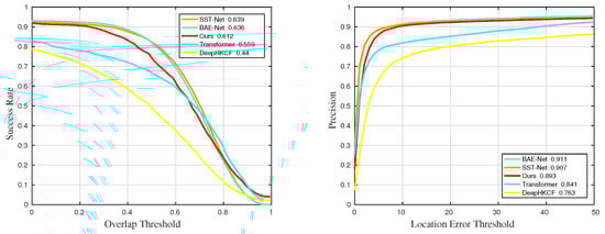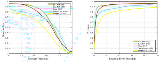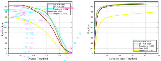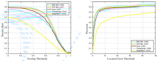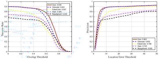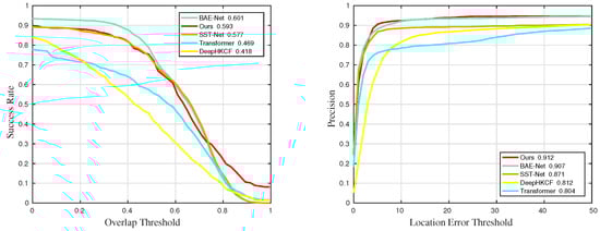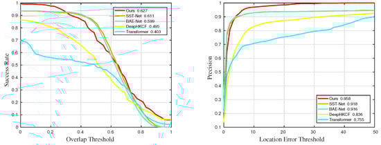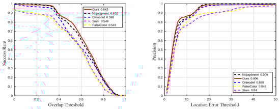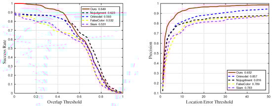 As shown in Figure 34, Figure 35, Figure 36, Figure 37, Figure 38 and Figure 39 and Table 5 and Table 6, the proposed algorithm achieves a good performance on the IMEC25 dataset. Different from the IMEC16 dataset, the images in the IMEC25 dataset are all in the near-infrared band. As a result, compared with the tracking algorithms trained with the IMEC25 dataset, BAE-Net, and SST-Net, the proposed algorithm has poor performance. However, compared with the other two algorithms not trained with the IMEC25 dataset, the performance of the proposed algorithm is much higher. Especially, when facing the challenge OCC, the proposed algorithm achieves a 0.627 success rate and 0.958 precision, which are the highest among all algorithms. However, when facing the challenge of RO, the proposed algorithm yields a 0.033 lower success rate and 0.014 lower precision than the transformer. This result means the transformer structure has more advantages than the convolution neural network structure.