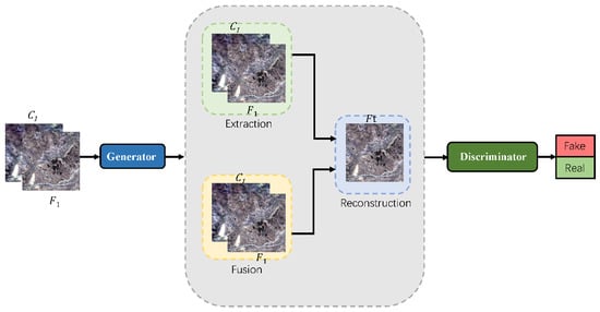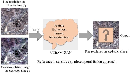 The continuous development of Earth observation technology promotes the increasing demand for high-temporal and high-spatial (HTHS) remote sensing images [1], which are mainly used in urban resource monitoring [2], crop and forest monitoring [3], scene classification [4], surface object detection and segmentation [5,6], carbon sequestration modeling [7], crop yield prediction [8], and disaster monitoring [9]. However, due to the limitations of current technology and financial budget, it is difficult to obtain simultaneous remote sensing images with HTHS requirements using a single satellite product. To solve this problem, we now combine satellite data from multiple platforms to obtain HTHS images [10]. For example, combining remote sensing images from the high-resolution Landsat and moderate-resolution imaging spectroradiometer (MODIS), the access time of the Landsat series satellites [11] is typically 16 days, and the spatial resolution is 30 m. Such remote sensing images can be used mainly in precision agriculture, land cover classification, and other research areas. The period during which MODIS acquires remote sensing images with low spatial resolution sensors is only one day, and the spatial resolution ranges from 250 to 1000 m [12]. Such images can provide daily remote sensing observations, but it is difficult to observe the very heterogeneous surface changes.