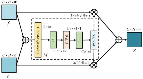 where and are two input features, is fusion feature. indicates the weight obtained by the channel focus module M (corresponding to the dotted box in Figure 4), and ranges from 0 to 1. It is composed of real numbers. , which corresponds to the dotted arrow in Figure 4, is also composed of real numbers between 0 and 1. ⊕ means that the elements are added directly, ⊗ means that the elements are multiplied.