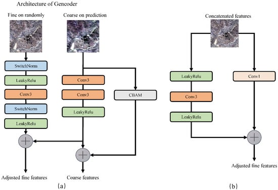 The generator consists of two building blocks: an encoder and a decoder. The encoder mainly extracts standard high-pass features over the main branch, and the decoder restores the original data while recovering the data for dimensionality reduction processing. In the structure of this generator, we mainly describe the encoder. As shown in Figure 5a, an arbitrary fine-resolution image is input through the main branch. The coarse resolution of the prediction time is input through the horizontal branch, generating fine intermediate features. From Figure 5a, it can be seen that the principal component consists of a switchable normalization [56] and leaky recognized linear unit (LeakyReLU) [57] function with two cycles. In the middle, a convolution operation with a step size of 2 and a convolutional kernel size of is performed to reduce the feature size. In the horizontal branch, we use convolution operations twice to obtain coarser spectral information, and add a flexible CBAM module to adaptively rescale the spatial and channel features without increasing computational complexity to enhance the salient regions and extract more detailed features. In the concatenated block used in the generator decoder (as shown in Figure 5b), we use a convolution operation in the horizontal branch, mainly to adjust the channel of feature mapping to match the balanced output. At the end of the encoder, we match the extracted fine, coarse, abstract, and multi-level features and merge them with the decoder. In the whole generator, we use switchable normalization (SN) from feature extraction to fusion. There are four reasons for selecting SN. First, switchable normalization is a learnable normalization method driven by task and data, which can learn different normalization layers of deep neural network; Second, SN is an end-to-end learning method. It can learn important weights in the network and switch at will; Third, SN uses three different ranges to calculate statistics (mean and variance), including channel, layer and small batch. It is robust for various batch sizes and can maintain high performance even in the case of small batches. Third, SN has no sensitive hyper-parameters, and the whole network is lightweight. At the same time, after normalization, we use the leaky corrected linear unit (LeakyReLU) function to ensure that the weight is updated and maintained throughout the network propagation process. Formula (5) indicates that switchable normalization normalizes the detailed features of the reference image in phase i, Formula (6) indicates that the end-to-end PixelShuffler module is used to upsample the spatiotemporal features in phase i and , and Formula (7) indicates that the multi-level features obtained in phase i and are fused. Feature fusion throughout the generator can be expressed as follows:
