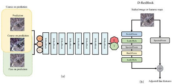 The discriminator refers to the GAN-STFM model [18] and is a binary classifier consisting of resnet residual blocks (D-resBlocks). As shown in Figure 6, the first input of the discriminator is a pair of coarse images and at prediction time or a prediction image. Since we want to reduce the dependence of the whole model input image on the time series, we use the coarse image of the prediction time as the primary training data set in the training process. Second, as shown in Figure 6b, we use the main branch and transverse branch in each D-resBlocks, and use spectral normalization to stabilize the whole confrontation process. Finally, the conditional input of the discriminator is downscaled to different scales, the coefficients are set to and , and a multi-scale discriminator is used to quickly improve the initial image.