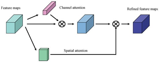 Given an intermediate feature map as input , CBAM successively derives a one-dimensional channel map and two-dimensional spatial map , and is the final refined output.