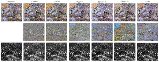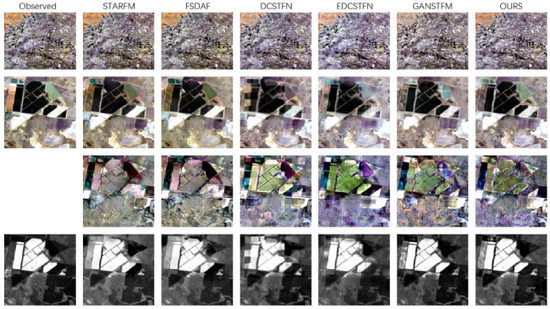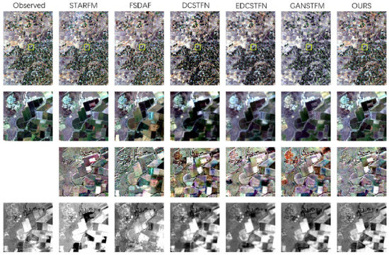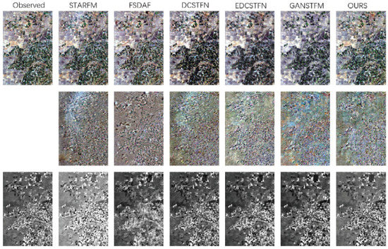 To visually represent our experimental results. Figure 8, Figure 9 and Figure 10 show the comparison results of FSDAF [25], STARFM [38], DCSTFN [43], EDCSTFN [44], GANSTFM [18] and the MCBAM-GAN model proposed in this paper for the dataset CIA.