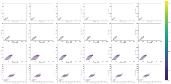 Figure 8 shows the local experimental results we obtained with the CIA dataset. We have extracted some prediction results for display. Below that, “Observed” represents the actual observed image, the first line represents the predicted image of the model, the second line represents the difference between the predicted result and the actual observed value, the third line represents the normalized vegetation index (NDVI) of the predicted value, and “Our” represents our MCBAM-GAN method. From the overall effect picture, it can be seen that our proposed method has excellent visual experience, and the definition is much closer to the original image. Figure 8 shows almost the same model image and the actual image. We have added multi-scale ideas at each stage of feature extraction, feature fusion, and reconstruction. We also extracted coarse, fine, and spatio-temporal features of different dimensions. However, from the perspective of the spectrum, the traditional methods are more advantageous. To achieve a subjective evaluation effect, we extracted and enlarged some areas, as shown in Figure 9. The first line represents the prediction results of each model, the second line represents the magnified representation of the yellow box, the third line represents the difference between the magnified area and the actual observed value, and the fourth line represents the NDVI of the magnified area. From the figure, it can be seen that the areas with dense STARFM and FSDAF features are the reason why traditional methods focus only on temporal and spatial features and ignore the details of texture features. The methods based on deep learning, such as EDCSTFN and GANSTFM, can not only predict dense areas but also clearly identify the differences between different color areas and predict farmland, roads, and other information more accurately. However, the results show that the effect on irregular areas could be better. The reason is that the CIA dataset mainly contains crop phenology dataset, including many farmland planting and irrigation areas. Figure 10 compares the thermal scatter plots of the predicted results of each model in the CIA dataset. In Figure 10, each row represents different models. A total of six models are shown in the figure. Each column represents the thermal scattering diagram of each model in four bands. The thermal scatter graph is mainly used to locate and count targets. It can be seen that the “point cloud” of our method is sparse in each band, indicating that the prediction results of our method are closer to the actual observated values and also indicating that our method is more robust in dealing with complex changes.