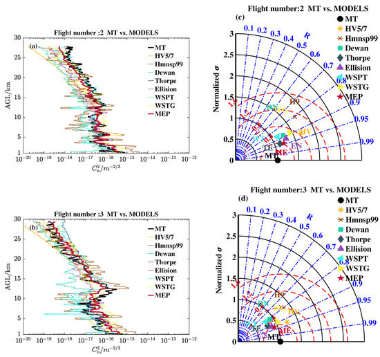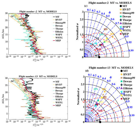 Measured and estimated profiles in ECACN. (a,b): single day profiles; (c,d): corresponding Taylor diagram of a single day statistics. The black solid curves in circles mark MT and models normalized standard deviation ; the blue dashed lines mark the correlation coefficient R; the red dashed lines mark the root-mean-square difference between the models and MT. Intuitively, the closer the model is to the reference (MT, the black circle solid point) in the diagram, the better the estimation is.