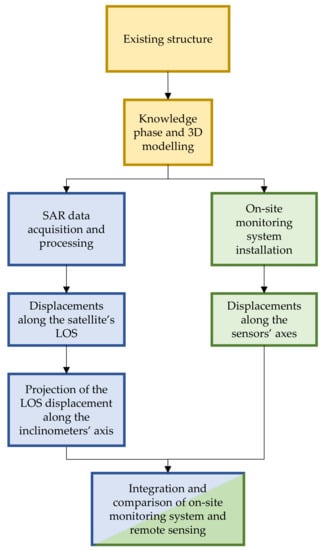 This section describes the procedure followed for monitoring the structure under investigation. Firstly, a geometrical reconstruction was exploited to obtain a 3D model of the building. Then, data deriving both from on-site monitoring system and remote sensing tools were investigated separately to detect the main displacement phenomena. Lastly, a comparison between the on-site results and the remote sensing results was carried out to find any difference or correspondence between the two methodologies. Each step of the procedure, presented in Figure 1, is detailed below.