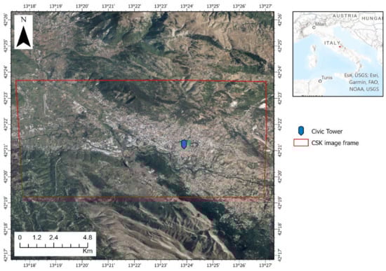 On 6 April 2009, an intense Mw 6.3 earthquake struck the city of L’Aquila (Figure 2), which is located in the western part of the Abruzzo Region (central Italy). The earthquake caused over 300 casualties, about 1600 injured and left over 60,000 people without shelter []. According to the National Institute of Geophysics and Volcanology (INGV) in Italy, the hypocenter is located about 2 km from the city at a depth of 9 km. Numerous historic and highly vulnerable buildings were strongly damaged by the earthquake [,], including Palazzo Margherita and the Civic Tower in the medieval city center.