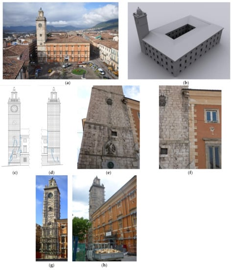 The structure of Palazzo Margherita (a) and the Civic Tower; 3D model (b). Crack pattern survey on the south (c) and east (d) side. Crack detected at the interface between the tower and the palace (e,f). Provisional interventions after the earthquake on the tower (g) and the palace (h).