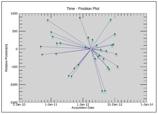 The interferometric process was carried out performing the series of actions described below. The first step includes the connection graph, in which a master image was connected to all the images (slaves) to create the pairs (Figure 5). The slaves were then co-registered to the master for the interferogram generation. In this step, an oversampling of a factor 4 in range direction was applied to all the images and the topographic contribution of each interferogram was removed by using the 30 m ALOS-DEM provided by the Japanese Aerospace Exploration Agency (JAXA). The PSs identification was carried out in the first inversion by considering the Amplitude Dispersion Index (ADI), which is defined as the ratio between the standard deviation and the mean of the amplitude values of a pixel []. Moreover, during the first inversion, a linear velocity model was applied to estimate residual height and displacement velocity. In the second inversion, the atmospheric phase component was estimated and filtered by using both high-pass and low-pass filters. The last step is the geocoding, in which the PSs with coherence below 0.70 were discarded and the interferometric products were geocoded in WGS 84 coordinate system.