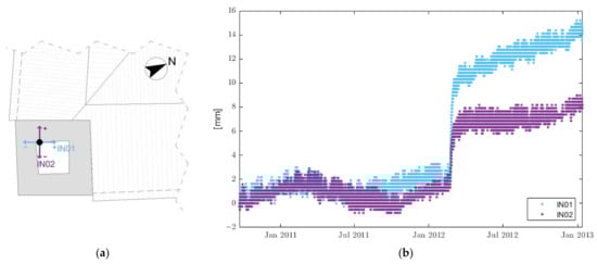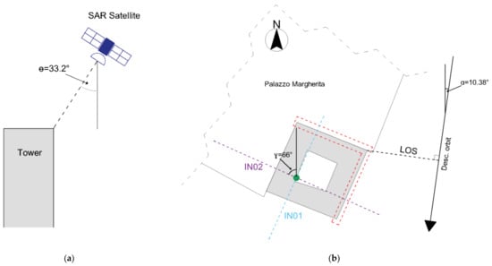 To better clarify the aforementioned issues, Figure 9a shows the vertical SAR acquisition geometry, while in Figure 9b the location and the direction of measures for both the physical sensor and InSAR in the horizontal plane are presented. The green dot indicates the location in which the physical sensor is installed and measures are recorded. The direction of the acquisition is delineated by the axes of the instruments (cyan for IN01 and violet for IN02). The red dashed line shows the main sides in which the MPs are detected by the MT-InSAR technique, and the black dashed line indicates the projection of the LOS in the horizontal plane. It is possible to notice that IN01 refers to a nearly south–north direction that cannot be detected by the SAR, while the IN02 axis and LOS projection have a difference in the orientation of 13.62 degrees. Since the deformation along IN01 is hardly measurable by the SAR sensor due the almost polar direction, only IN02 has been used for a direct comparison with the InSAR recorded measurement. Thus, it is possible to estimate the LOS displacement component along the IN02 direction as Equation (1):