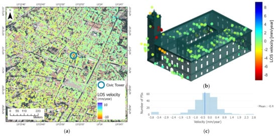 Overview of the LOS velocity (mm/year) derived from the PS-InSAR analysis for the city center of L’Aquila (a) and both Palazzo Margherita and the Civic Tower (b). Negative values range from yellow to red color, positive values from cyan to blue. The frequency distribution of the PSs over Palazzo Margherita, excluding the Civic Tower, is shown in (c).
