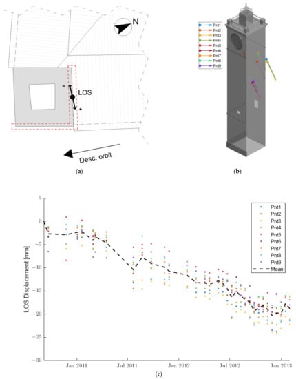 Sketch of the Civic Tower’s walls backscattering the radar signal to the satellite (a), distribution of the PSs along the tower’s height (b), displacement time series of each point (c).