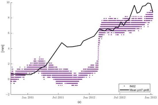 where is the projection of LOS displacement along the IN02 axes, is the recorded displacement along the LOS, is the angle between the LOS and the vertical direction, , is the angle between the IN02 axis and the north direction and is the angle between the orbit path and the north direction. Equation (1) was used to obtain the projected time series of the mean displacement recorded for measurement points 7 and 8, located at the same level of the inclinometers (Figure 9c). The figure shows that the trends are well correlated in the initial and final part of the observation period, whereas a deviation can be detected in the middle part (from March 2011 to April 2012). The reason for this discrepancy is not easy to assess and it could be affected by several factors. First it should be considered that during the InSAR analysis a linear model has been adopted, thus highly non-linear behaviors like the one present in this case study are hardly detected. In fact, most PS algorithms presented in the literature implement only the linear model behavior. Moreover, the discrepancy is heightened by the low satellite revisit time, since in the case of images being too far apart in time, sudden changes in the behavior are underestimated. Indeed, during the diverging period, in addition to the rapid change in behavior already reported, the available images are sparse as the satellite revisit time increases to an average of 49 days.