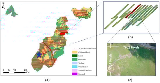 Data collection. (a) Map of Hadatu Pasture and UAV flight routes; (b) flight strip image captured and mosaiced by the UAV; (c) original image sample of the UAV.