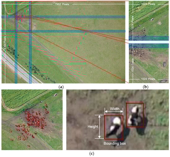 For the training and testing of the deep learning model, we used Labelme 4.6.0 [26] software to label the data on the original UAV images. This study used a rectangular box to label the ground truth, as shown in Figure 2c. The box was composed of an upper left point and a lower right point, using which the width and height of the object on the image could be obtained.