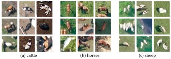 Seventy-five original UAV images with livestock were selected, and after the split, there were a total of 4050 image subpatches, including 469 animal patches (images containing animals), to build the dataset. The set was randomly divided into training, validation, and testing datasets with a ratio of about 7:1:2. More details about dataset allocation are shown in Table 1. Figure 3 shows the image samples in the dataset containing three types of animals: cattle, horses, and sheep. Figure 4 shows some object instances of the three types of animals in the dataset.
