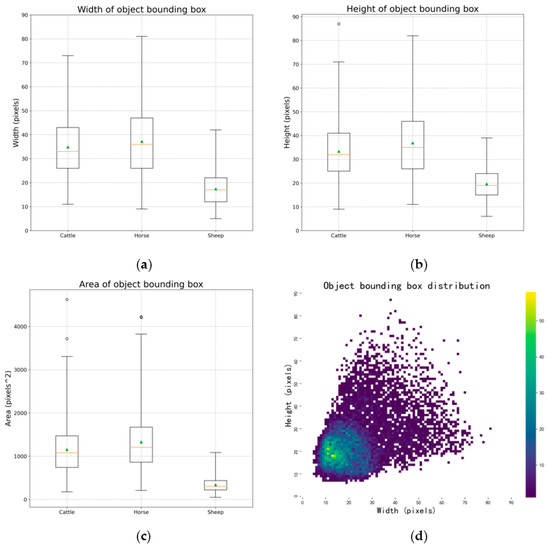 Table 2 and Figure 5 are the statistical information of the animal samples in the dataset, as shown below. From Figure 5d, it can be seen that the side length of most object boxes is 10–20 pixels. The size of most sheep objects is in this range. The mean absolute size (MAS) is defined as the square root of the object box average area, while the mean relative size (MRS) is defined as the percentage of the mean area to the total patch area. The formula is as follows: