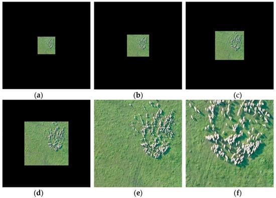 In order to test the multi-scale adaptability of the model, we made a multi-scale dataset with nine scales of 0.2, 0.25, 0.33, 0.5, 1, 2, 3, 4, and 5. Each scale set of the dataset consisted of 10 random animal patches, so there were a total of 90 patches, and each patch was still 1024 × 1024. Image scaling uses the bilinear interpolation method, in which an image with a scale smaller than 1 is a scaled-down image patch, and its surroundings are filled with zero values. In comparison, an image with a scale greater than 1 is the window for capturing the original image patch after scaling up, as shown in Figure 6. The details of the objects in the multi-scale dataset are shown in Table 3. Among them, the mean absolute size of the objects in the 0.2-scale set was already lower than 10 pixels, and the mean absolute size of the sheep was only 3.03 pixels. However, in the 5-scale set, the mean absolute size of sheep reached 72.04 pixels, and that of cattle reached 179.24 pixels. Generally, the multi-scale dataset scaled across an approximately 22–24 times change. Table 3 shows that the number of objects (scale > 1) was reduced due to the image being intercepted by the fixed window. The average size of the objects was not strictly proportional to the previous scale.
