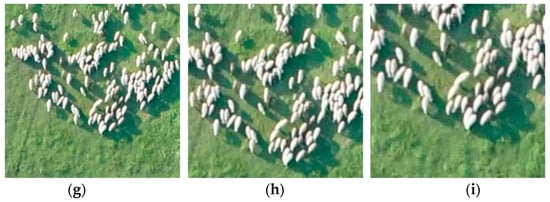 The detection results of the model at scales of 0.5, 1, and 2; (a–c) cattle at scales of 0.5, 1, and 2; (d–f) horses at scales of 0.5, 1, and 2; (g–i) sheep at scales of 0.5, 1, and 2.