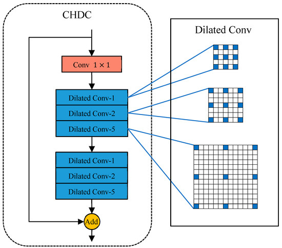 The designed cascaded hybrid dilated convolution module (CHDC), in which dilated conv-1, 2, and 5 are dilated convolutions with dilated rates of 1, 2, and 5, respectively, as shown on the right.