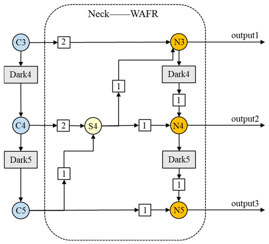 Therefore, to facilitate the detection of small objects in our dataset, we propose a new feature fusion structure: a weighted aggregation feature re-extraction pyramid (WAFR) with top-down and bottom-up two pathways as well. In this structure, the weighted fusion is started from the highest layer upwards, and the way of concatenating in the original PANet is abandoned, instead of the form of matrix addition. The fusion formula is as follows: where is 2:1, and is 2:1, the N3 layer after the top-down weighted fusion is re-extracted by the Dark4 and Dark5 in the backbone. Moreover, the S4 layer and the C5 layer are cross-fused during the extraction process. Finally, three feature map outputs with different scales are obtained. The structure is shown in Figure 11.