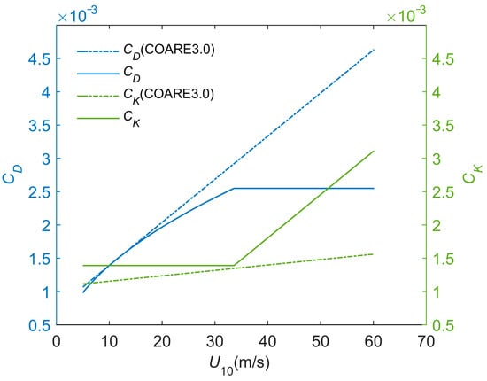 where τ , Q L , and Q S are the momentum, latent heat, and sensible heat fluxes, respectively; ρ a is air density; L v is the latent heat of vaporization; C p is the specific heat capacity of humid air; C D , C L , and C S are the surface exchange coefficients at 10 m height for drag (momentum), latent heat, and sensible heat, respectively; U 10 is the 10 m wind speed above the sea level; q is the specific humidity; and θ is temperature. Subscripts “10” and “s” indicate reference heights of 10 m and the sea surface, respectively. Komori et al. [16] verified the conventional assumption that C K = C L = C S . Figure 1 shows the curves for C D and C K from COARE 3.0 (for details, see the Appendix A) and Komori et al. [16].