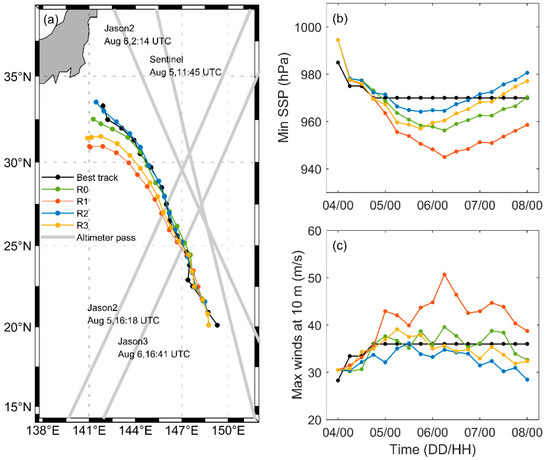 Figure 2. JMA best track data for Shanshan and simulated results from four different numerical experiments at 6-hourly intervals from 00:00 UTC 4 August to 00:00 UTC 8 August 2018. (a) Track; (b) minimum sea surface pressure; (c) maximum wind speed at 10 m. Grey lines in panel (a) indicate the ground tracks of altimeters Jason-2, -3, and Sentinel during the period covered in the Shanshan simulations. See Table 1 for details of the different numerical experiments.