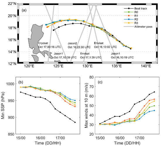 Figure 3. JMA best track data for Megi and simulated results from four different numerical experiments at 6 h intervals from 00:00 UTC 15 October to 18:00 UTC 17 October 2010. (a) Track; (b) minimum sea surface pressure; (c) maximum wind speed at 10 m. Grey lines in panel (a) indicate the ground tracks for altimeters Jason-1, -2, Cryosat, and Envisat during the period covered in the Megi simulations. See Table 1 for details of the different numerical experiments.