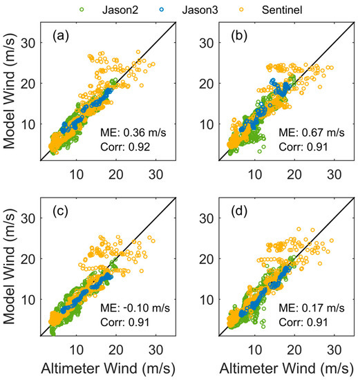 4.2. Validation for Surface Waves and Winds Using Altimeter Observations