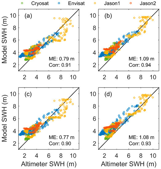 Figure 8. Typhoon Shanshan. Comparison of altimeter observed SWH with model results from experiments (a) R0, (b) R1, (c) R2, and (d) R3. See Table 1 for details of the different numerical experiments.