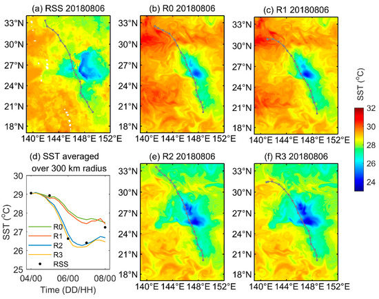 Figure 10. Daily mean SST on 6 August 2018 for Shanshan. (a) SST from RSS observations; (b,c,e,f) simulated SSTs from R0, R1, R2, and R3, respectively; (d) time series of SSTs averaged over 300 km radius inner core region along Shanshan center location.