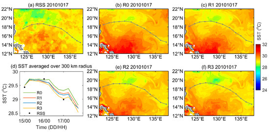 Figure 11. Daily mean SST on 17 October 2010 for Megi. (a) SST from RSS observations; (b,c,e,f) simulated SSTs from R0, R1, R2, and R3, respectively; (d) time series of SSTs averaged over 300 km radius inner core region along Megi center location.