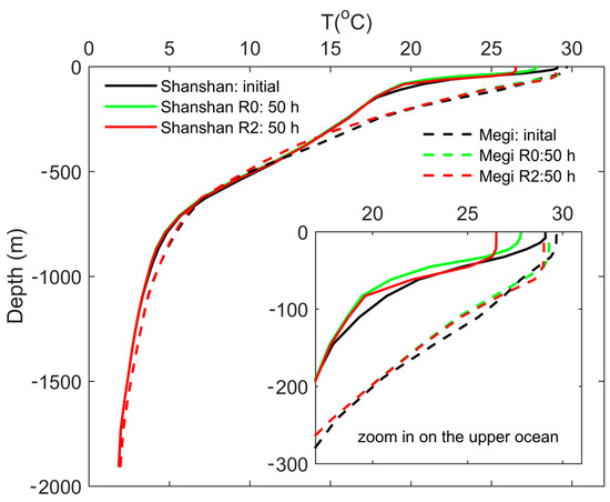 Figure 12. Water temperature profiles for Shanshan and Megi at the initial time (prior to the arrival of the TCs) and simulation time of 50 h (the arrival of the TCs) in R0 and R2. The green (red) solid and dotted lines represent the water temperature profiles in R0 (R2) at the simulation time of 50 h for Shanshan and Megi, respectively. The black solid and dotted lines display the water temperature profiles at the initial time for Shanshan and Megi, respectively. Note that the initial water temperature profiles of R0, R1, R2, and R3 for Shanshan (or Megi) are the same.