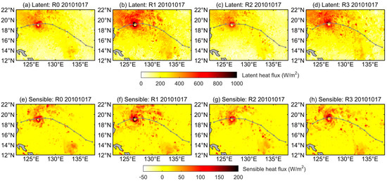 Figure 13. Distributions of heat fluxes for Shanshan. (ad) Distributions of modeled latent heat fluxes for 6 August 2018 in R0, R1, R2, and R3; (eh) distributions of modeled sensible heat fluxes for 6 August 2018 in R0, R1, R2, and R3. Grey lines are the simulated tracks for Shanshan. See Section 3.1 for details of the simulations.