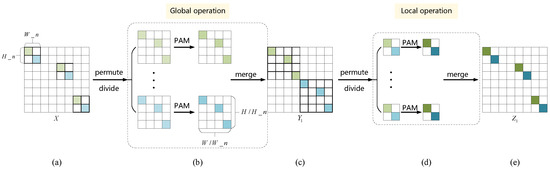 The structure of the proposed sparse position self-attention module (SPAM). (a) The input image is divided along position dimension. (b) PAMs are performed in rearranged small regions. (c) The pixel position of the feature map is restored to the original combination. (d) PAMs are performed in restored sub-regions. (e) The output of SPAM is obtained.