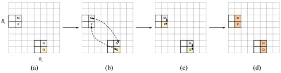 The information propagation process of the proposed SPAM. (a) M and P are the two pixels in region ; and N and Q are the two pixels in region . (b) During the first PAM operation, the information is transmitted between M and N and between P and Q, respectively. (c) During the second PAM operation, the information is transmitted between M and P and between N and Q, respectively. (d) M, N, P, and Q contain global and local information.