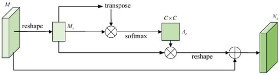 where measures the influence of different channels. Then, is multiplied by the transpose of , and the multiplication is reshaped to . Finally, the product is multiplied by the scale coefficient and added to the original feature M to obtain the final feature map , as follows: