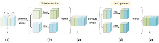 The details of SCAM are shown in Figure 6. First, the feature map X is divided into groups in the channel dimension. The channel number of each group is . Figure 6 illustrates the details of SCAM, taking as an example. Then, the groups are further divided into sub-groups, named , , …. The channel number of each sub-group is . Next, for each channel group, sub-groups in the same relative position (for instance, , , …) are taken out to rearrange and generate new channel groups , , …. The feature map is obtained by operating CAMs in new groups. Finally, is restored to the original channel arrangement, and is acquired by performing CAMs in original groups .