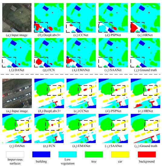Visual results achieved by different networks on ISPRS Potsdam dataset. For the first group, other methods incorrectly predict pixels inside impervious surfaces. For the second group, several pixels representing cars are incorrectly predicted. However, our SAANet can maintain category consistency and obtain more accurate pixel classification.
