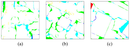 Visualization results of the difference between predictions and labels. (a–c) from the test set of the Vaihingen dataset. Note that most of the regions with inaccurate segmentation are boundary regions.